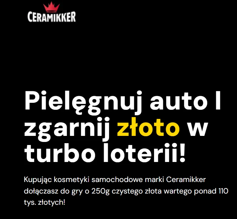 - Między 17.11.2025 r. a 20.12.2025 r. dokonaj jednorazowego zakupu dowolnych produktów* marki CERAMIKKER w sklepie internetowym www.ceramikker.pl za minimum 100 zł brutto, a następnie wypełnij formularz rejestracyjny dostępny na stronie https://ceramikker.pl/turbo-loteria-lp1/