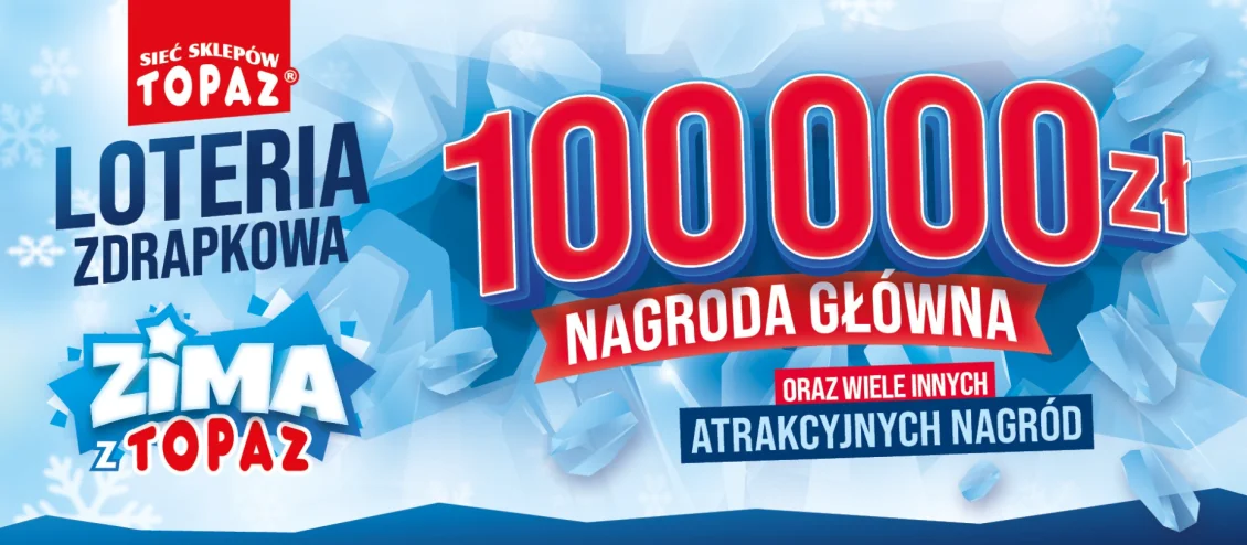 - Między 01.12.2025 r. a 18.01.2026 r. dokonaj zakupu za min. 69 zł brutto* i/lub zakup produkty partnerów akcji (oznaczone logo loterii) za min. 20 zł brutto w sieci sklepów TOPAZ lub TOPAZ Express
