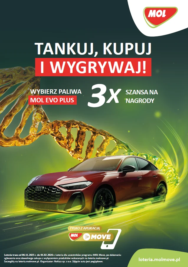 - Między 06.11.2025 r. a 01.02.2026 r. dokonaj jednorazowego zakupu, przy użyciu karty MOL Move, towarów i usług* dostępnych na stacji za dowolną kwotę.